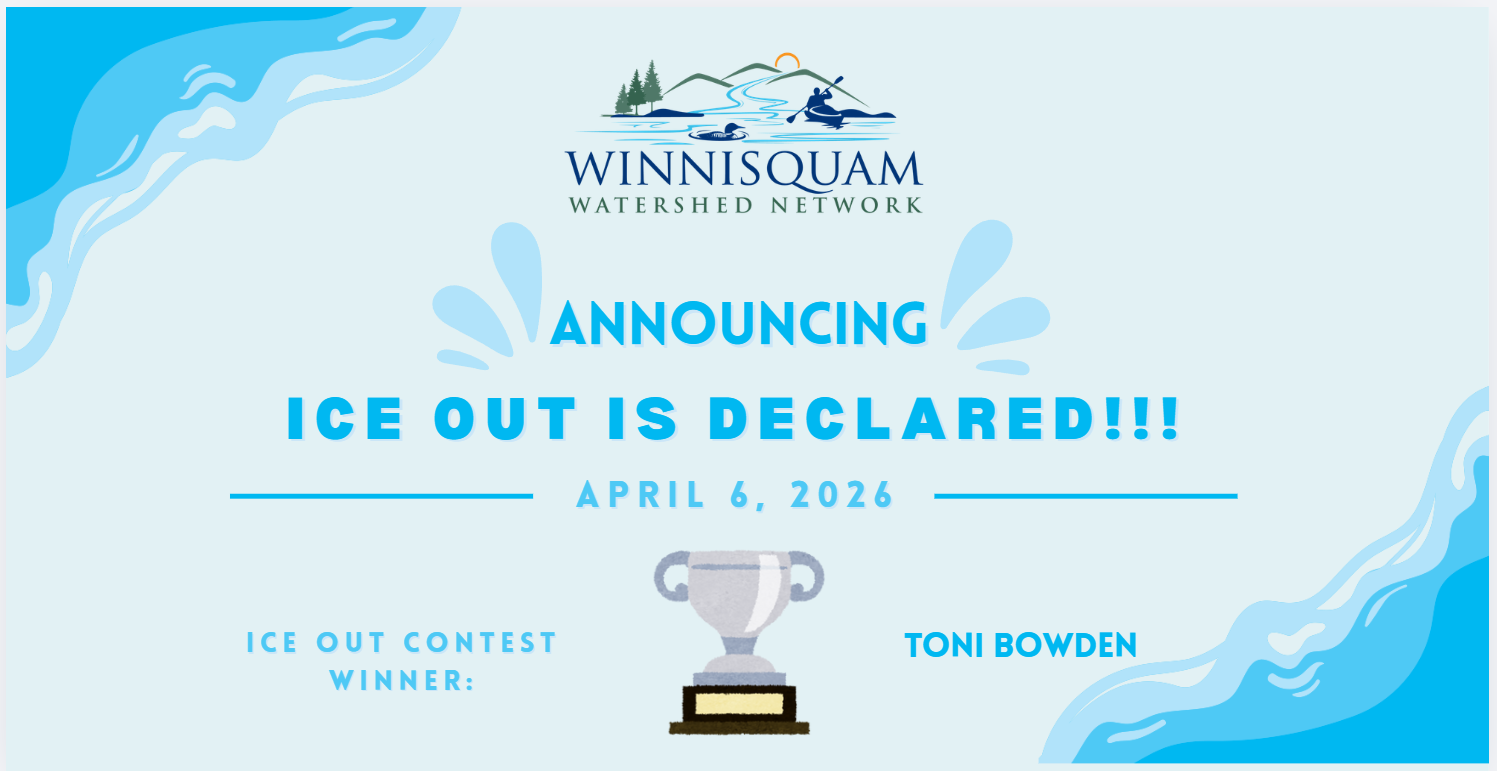 Congratulations to WWN member Toni Bowden who had the sole submission of April 6th as her projection for Ice-Out. Toni will receive the coveted WWN Ice-Out Contest Winner Trophy, and she also had the opportunity to "Split the Pot" of $730 with WWN on the total dollars collected in Ice-Out Guess submissions. Toni has generously offered to donate her winnings back to WWN! Thanks to all who submitted guesses and in turn supported the work of the Winnisquam Watershed Network.