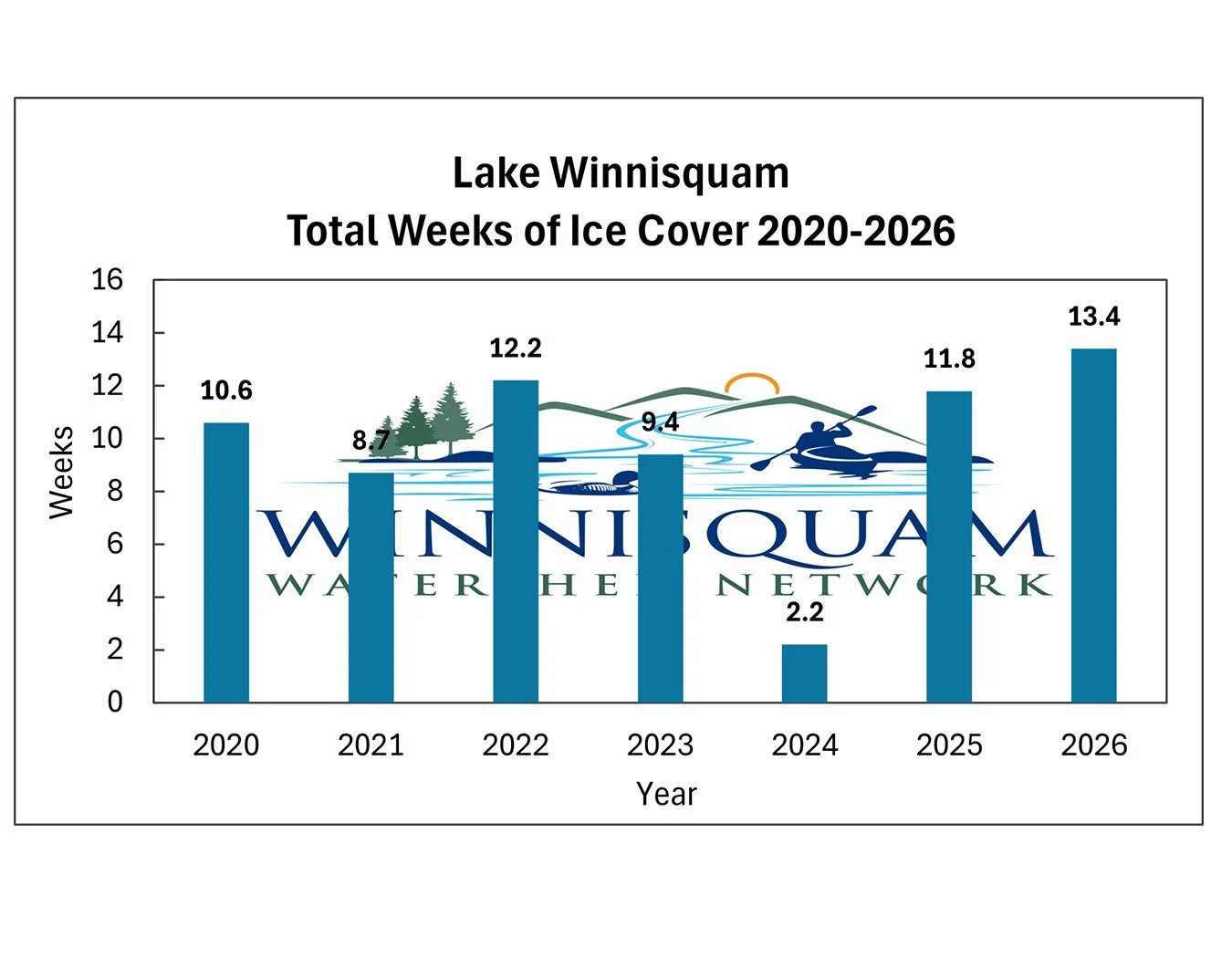 The length of ice cover each winter is a key indicator of a lake’s health and changing climate conditions. In recent years, shorter ice cover periods have meant earlier warming of the water, which can impact fish habitats, reduce oxygen levels, and shift the timing of aquatic plant growth. These changes can also increase the risk of harmful algal blooms later in the season. By tracking ice-in and ice-out dates on Lake Winnisquam, scientists and local organizations can better understand long-term trends and take action to protect the lake’s water quality and ecosystem.